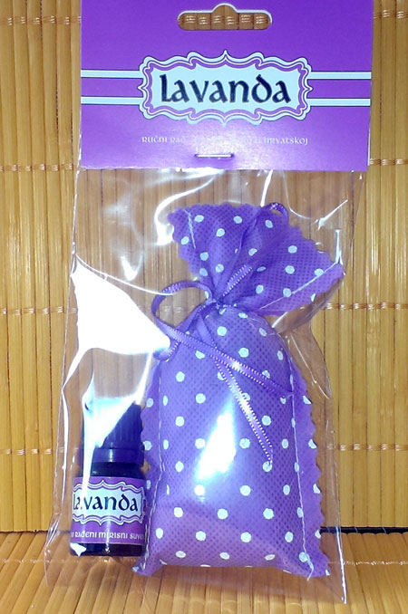 Organza vrećica (dizajn vrećice može varirati) sa malim sapunom (cca 30g) i bočicom lavandinog ulja od 2,5ml